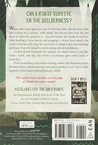 Details: Product Description Wall-E meets Hatchet in this New York Times bestselling illustrated middle grade novel from Caldecott Honor winner Peter Brown Can a robot survive in the wilderness? When robot Roz opens her eyes for the first time, she discovers that she is all alone on a remote, wild island. She has no idea how she got there or what her purpose is--but she knows she needs to survive. After battling a violent storm and escaping a vicious bear attack, she realizes that her only hope for survival is to adapt to her surroundings and learn from the island's unwelcoming animal inhabitants. As Roz slowly befriends the animals, the island starts to feel like home--until, one day, the robot's mysterious past comes back to haunt her. From bestselling and award-winning author and illustrator Peter Brown comes a heartwarming and action-packed novel about what happens when nature and technology collide. Review Praise for The Wild Robot: A New York Times Bestseller An Entertainment Weekly Best Middle Grade Book of the Year An Amazon Best Book of the Year Top Pick An IndieBound Bestseller An ALA Notable Book for Children New York Public Library Best Books for Kids Pick Kirkus Best Children's of the Year Pick School Library Journal Best of the Year Pick Bank Street College of Education Best Children's Book of the Year Pick Sunshine State Young Readers Award List Pick "Brown has written a lively tale that is sure to engage young readers."― The New York Times "Roz may not feel emotions, but young readers certainly will as this tender, captivating tale unfolds."― The Washington Post * "[Peter] Brown's picture books are consistent bestsellers and critically acclaimed. Expect readers to go wild for his robot-themed novel."― Booklist, starred review * "While the end to Roz's benign and wildlife is startling and violent, Brown leaves Roz and her companions--and readers--with hope. Thought-provoking and charming."― Kirkus, starred review * "This strong debut middle grade novel by the acclaimed picture book author/illustrator is a first purchase for most middle grade collections."― School Library Journal, starred review * "Brown's middle-grade debut, an uplifting story about an unexpected visitor whose arrival disrupts the animal inhabitants of a rocky island, has a contemporary twist...Brown wisely eschews a happy ending in favor of an open-ended one that supports the tone of a story that's simultaneously unsentimental and saturated with feeling."― Publishers Weekly, starred review "Roz is not easy to forget."― The Horn Book About the Author Peter Brown is the author and illustrator of many bestselling children's books, including Children Make Terrible Pets and The Curious Garden. He is the recipient of a Caldecott Honor for Creepy Carrots!, two E.B. White Read Aloud Awards, a New York Times Best Illustrated Children's Book award, and a Children's Choice Award for Illustrator of the Year. Peter's website is www.peterbrownstudio.com.