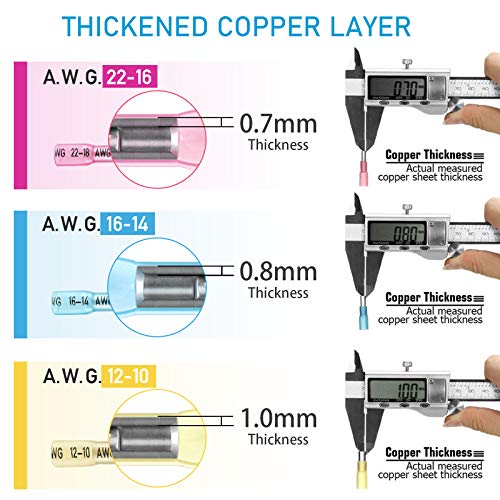 - 【DURABILITY】: Each butt, ring and fork terminal features a thick tinned copper barrel that resists corrosion to hold the wire tight when crimped. The barrel is created from one seamless piece of copper that eliminates the problem of the barrel opening. Your wire will never slip out of the connector