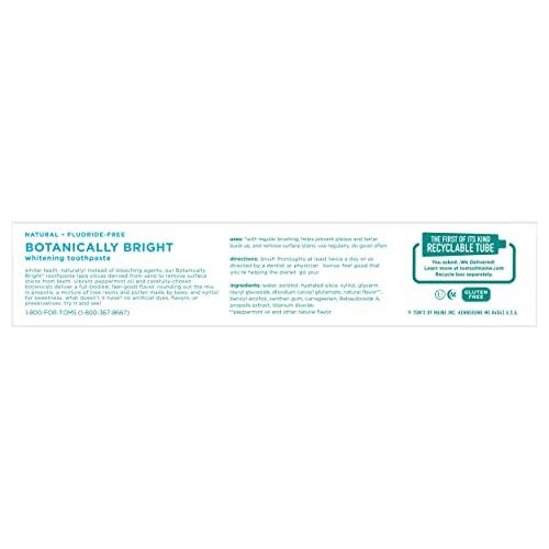 Details: Tom's of Main Botanically Bright Toothpaste gives your mouth a foamy clean feeling every time you brush. This SLS-free toothpaste helps whiten your teeth by removing surface stains. Made with bee propolis tincture and xylitol, this fluoride-free toothpaste will leave your mouth feeling healthy and fresh with the cool taste of Peppermint. Order Tom's of Maine toothpaste, and try their other natural dental care products. Tom's of Maine products use only ingredients that meet its stewardship standards for natural, sustainable and responsible, helping empower families to live more naturally. Tom's of Maine is a Certified B Corp and meets the highest standards of social and environmental performance, as well as public transparency. The company donates 10% of profits to charities committed to children's health, education and the environment. Thank you for supporting Tom's of Maine.