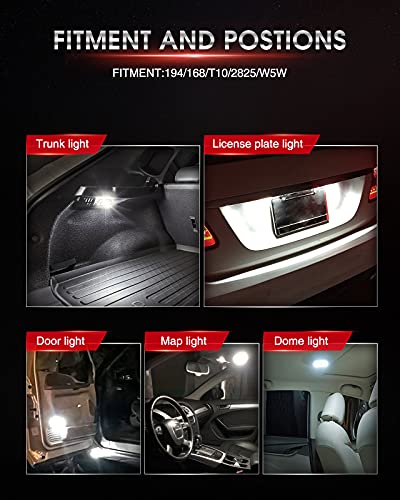 - Fitment and Positions: 194/168/T10/2825/W5W, dash led bulb,door light, license plate light, map light, dome light, trunk light, instrument panel light, glove box light, instrument cluster dashboard bulbs dash lights and so on