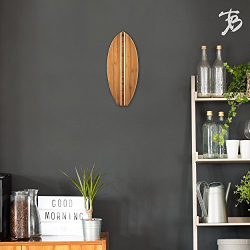 Details: Bring home beach vibes with the Totally Bamboo Lil' Surfer Serving and Cutting Board. This beautifully designed, surfboard-shaped cutting board blends multiple shades of bamboo with an eye-catching inlay down the center. It's perfect for adding a tropical twist to your next charcuterie or cheese board. The included hanging hole and tie also allow it to double wonderfully as wall décor. Crafted from sustainable Moso bamboo, the Lil' Surfer is lightweight, durable and gentle on knives. It's perfectly sized for cutting garnishes or slicing cheese at 14-1/2" x 6" x 5/8". When it's time for cleanup, the board quickly wipes clean; do not soak or wash in the dishwasher. Whether used as a cutting board, serving at your next get-together, hanging on your wall or as a gift for the surfer in your life, this board is an epic choice.
