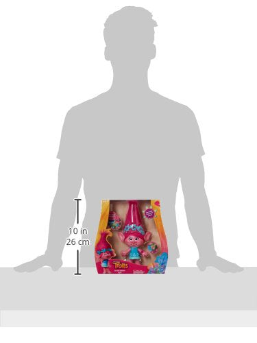 Details: DreamWorks Trolls Poppy is a heroic leader, lifting the spirits of everyone around her with positivity and the belief that, with a song in your heart, you can do anything! Sing along to the melodies in her heart with this musical Poppy figure. Press her watch to hear her sing her song "Get Back Up Again." She also sings "True Colors" and says phrases from the movie. The musical fun doesn't end there! Place her in front of her friend, DreamWorks Trolls Hug Time Harmony Branch (sold separately), to hear them sing "True Colors" together. These 2 also talk to each other for more Hug Time fun! DreamWorks Trolls Copyright 2017 DreamWorks Animation LLC. All Rights Reserved. Hasbro and all related terms are trademarks of Hasbro.