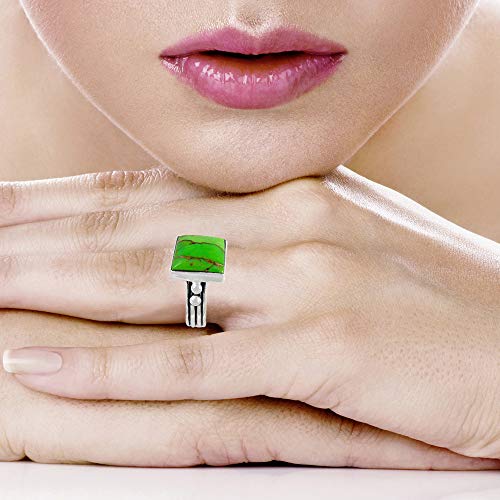 Details: Contemporary lady's ring in solid sterling silver and genuine turquoise. Fine craftsmanship. Trendy but with a touch of Southwest flair that is always exciting! Square centerpiece measures about 1/2" wide x 1/2" long (see ruler image). Gemstones Note: Due to the nature of turquoise, variations in colors/shades/matrix and imperfections are normal. Our turquoise has been stabilized, treated, and color-enhanced for beauty and durability. Satisfaction always guaranteed. Imported Turquoise Network is a proud member of the Gemological Institute of America (GIA), European Gemological Laboratories (EGL), and Better Business Bureau (A+ Rated).