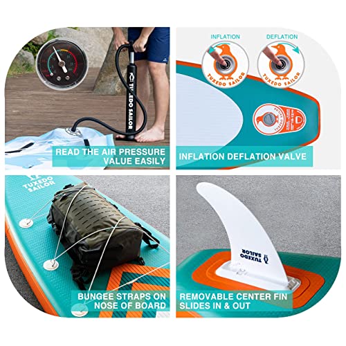 - 【Design and Use】 Tuxedo Sailor's unique ergonomic handle design allows you to inflate your paddle more easily in a shorter time. The sensitive barometer ensures that you can read the sup inflation pressure value (12-15psi) at any time. The multifunctional elastic string can tightly fix any objects placed on the inflatable paddleboard. The multipurpose and ultra-large backpack can help you easily carry the paddle to any of your dream places.