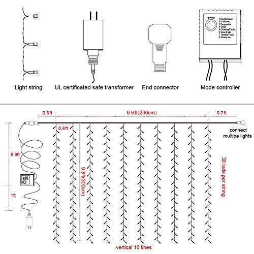 - High quality: 6.6ft*9.8ft(width*length), 300 WARM WHITE LED lights. UL Certificated Output and wire: 29V Voltage Safe Curtain Lights with UL certified, leads to 29V safe output by UL plug-in transformer.