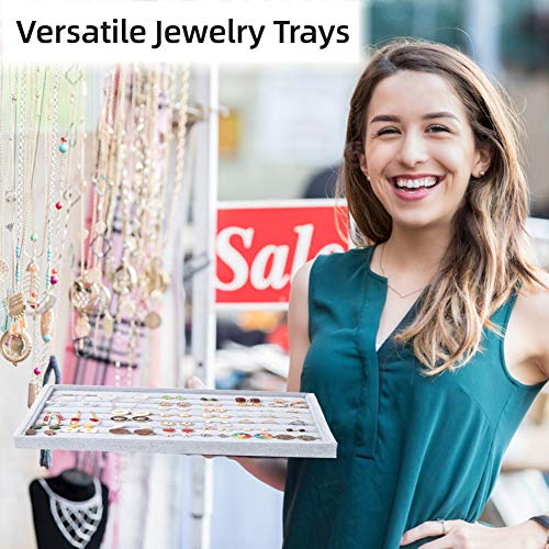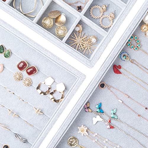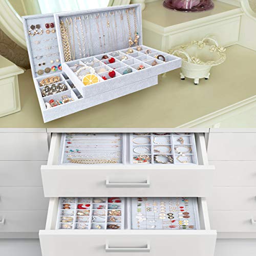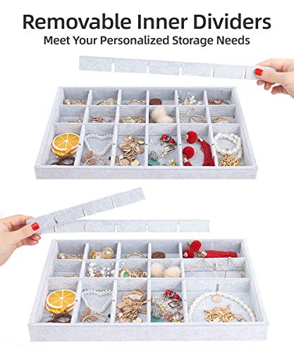 - PLENTY OF STORAGE OPTIONS: This jewelry tray set comes in 4 pieces with different layouts. Also the jewelry trays are stackable to offer extra storage spaces to accommodate your growing collections. The jewelry organizer easily fits in almost every drawer and shelf, or stack and leave on a dresser top, giving you plenty of storage options.