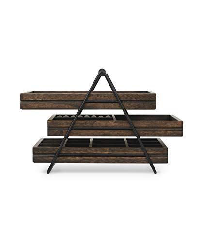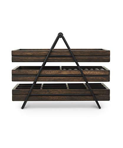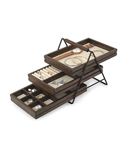 Details: For many of us, our jewelry is often some of our most prized possessions. It’s only natural to want to these precious pieces inside beautifully designed storage methods, that will keep them protected and well organized. With this elegant and cleverly designed set of stacked trays from Umbra, the solution (and your jewelry) will be easily on hand. Introducing the Terrace Jewelry Tray by Umbra The Terrace Jewelry Tray features three stacked trays, each with dividers optimized for organizing jewelry and keeping it safe, thanks to each tray’s linen lining, which is gentle on accessories while keeping them in place. Made of high-quality, Paulownia wood with an elegant, walnut finish, and a black metal wire frame for stacking its trays, Terrace is a piece you will be proud to leave out in your home. A beautiful, beige linen lines each of its exposed trays. Details This piece makes excellent use of vertical space, stacking the trays, freeing up space on your vanity or counter, while adding a nice decorative dimension of height and beautiful material to any vignette in your home. It measures 7 x 10 x 8 inches (17.8 x 25.4 x 20.3 cm). For a clever and elegant-looking method for storing your jewelry, order Terrace today. About Umbra: A global product design company providing original, modern, casual, functional, and affordable design for the home.