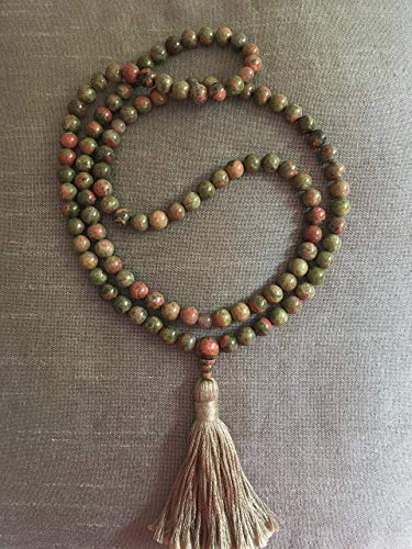 Details: Rich green and terra cotta colored unakite paired with light mocha colored moonstone spacers make up our 108 bead mala. It is finished with a unakite guru bead with three holes and a sage green cotton tassel.