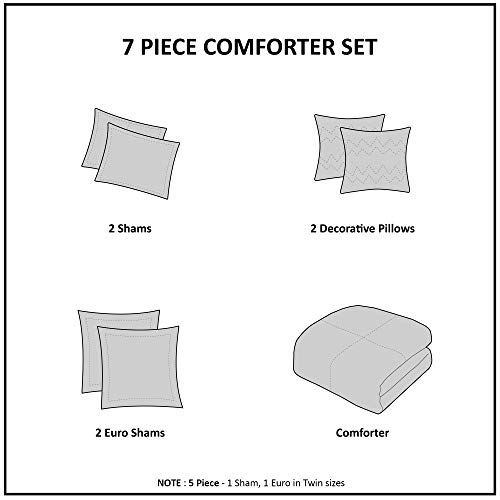 - Set includes: 1 Comforter:88"W x 92"L, 2 Standard Shams:20"W x 26" L, 2 Decorative Pillows:18"W x 18"L / 12"W x 18"L, 2 Euro Shams:26"W x 26"L + 0.5"Flange