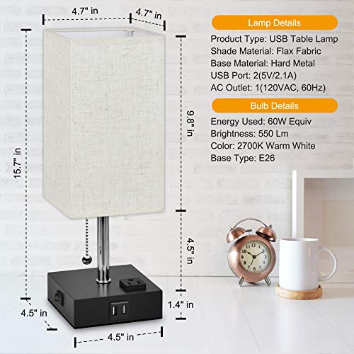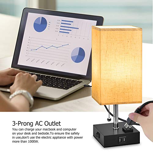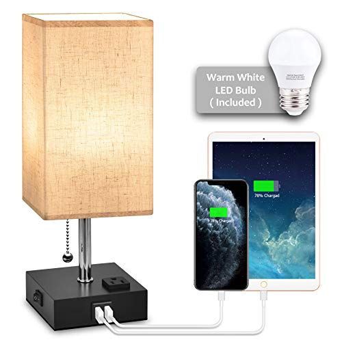 Details: ☞FEATURES -This table lamp include one E26 warm white light bulb that values for 3 dollars. -Easy enough to turn on/turn off the bedside nightstand lamp by pulling the chain. -Smooth square fabric linen lamp shade that protects you and your families' eyes. -The solid and non-slip mat at the bottom of the base to prevent scratching or slipping-The stable circuitry and standard UL listed US plug is safe enough for your families. ☞SPECIFICATION -Base Type: E26 standard base -Power Supply: AC Powered -Wattage: 60W Bulb Max -USB Charging Ports: 5V/2A -Plug: UL Listed US Plug -Base Material: Solid Wood -Shade Material: Fabric Linen-Size: 4.72x4.72x15.74inches-Weight: 23.81oz (bulb included) ☞PACKAGE 1*USB Bedside Table Lamp with US Plug 1*E26 Warm White Led Bulb (6W) 1*User Manual 2-year After-sale Service ☞INSTALLATION 1. Unscrew the fixing ring from the lamp holder. 2. Place the lampshade on the lamp holder. 3. Put the fix ring back to stabilize the lampshade. 4. Install the include E26 warm white light bulb. ☞ATTENTION -Indoor use only. Please keep the base dry. -Please cut off the power supply before installation for your safety. -Using the product on appropriate voltage and working environment. -Before tapping the base, please turn on the toggle switch (in the cord) firstly.