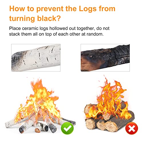 - 🔥【Using Tips】► Improper placement of birch logs for fireplace decoration can lead to inadequate gas combustion and cause birch fireplace logs to turn black. To prevent birch logs from turning black in the fireplace, then you need to adjust the placement of birch fireplace logs so that each ceramic fireplace log has a minimum contact area and even internal air circulation. We recommend using fireproof glass and glowing embers with it to give your fireplace and fire pit an artistic touch