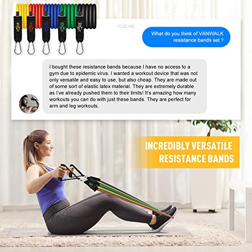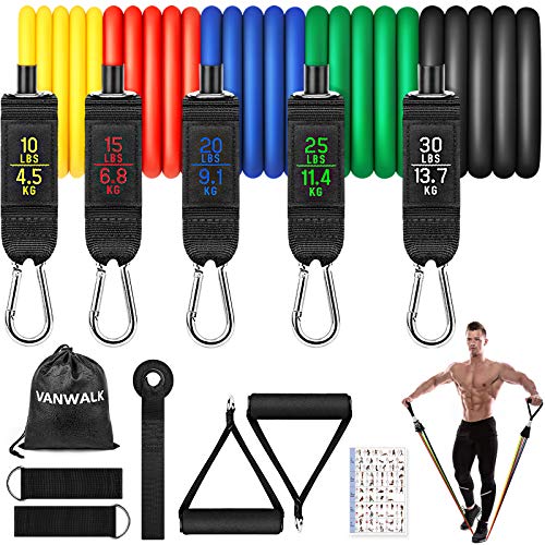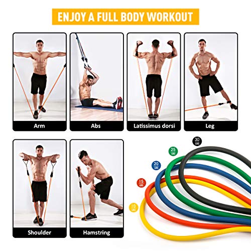 - [Adjustable Resistant Bands with Handles]: Includes yellow(10Lbs), red(15Lbs), blue(20 Lbs), green(25 Lbs), black(30 Lbs). The elastic workout bands can be used alone stacked in any combination to a maximum equivalent from 10lb to 100 lbs. Perfect for all whether beginners or expert, boys or girls, men, women