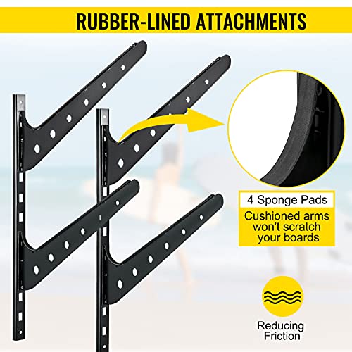 Details: Surfboard Rack This surfboard stand saves your board from excess wear and tear while also clearing floor space. With storage levels of up to 2 or more surfboards, this ski storage rack can accommodate the entire shivering board. Display your surfboard neatly and make room at home, in the garage, at a surf shop, or wherever you need to tidy up your surfboard. key Features Large Load Weight Our surfboard rack for wall features a practical, ergonomic two-layer design. It can hold up to 2 or more boards. Each layer holds 50 pounds (100 pounds in total), so it's suitable for surfboards, wakeboards, paddleboards, and more. Adjustable Height Featured with 11 holes on the push pin, the slotted wall track allows you to individually lock in each storage attachment to adjust the spacing between each level. It provides generous space for board storage while also helping to save space when not in use. Heavy-duty Structure The surfboard wall mount is made from solid steel to withstand heavy paddleboards and long boards while balancing sustainability and durability. The appearance of black baking paint can blend effortlessly into any existing interior design. Rubber-lined Attachments Each arm includes a rubber-coated edge at a 30-degree angle to provide a secure grip on your boards. This rubber also avoids excess scratching or dents to your surfboards so to extend its service life. Simple Installation Our surfboard wall rack is easy to set up. Arms are removable with a simple click of the push pin embedded on the connector, providing generous space for board storage but also helps to save unused space. Specifications Color: Black Material: Steel Max. Interval: 11.75" Length of Supporting Foot: 16" Wall Support Length: 24.5" Package Content 1 x 2-tier Surfboard Rack