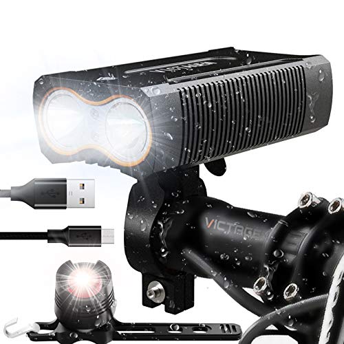 Details: New Product Release--BIG SALE: Order Now & Get a Free Taillights! Super Bright Bike Front Light The Victagen bicycle safety light is super bright, you no longer have to worry about riding in a dark road. Rechargeable front lights Bike Headlamp can be charged by USB. Stop wasting your money on the batteries! All in one design & bike light Torch light- Front Light can be Used as a Standalone Flashlight - Simple Dismount for Easy Charging and Protection Against Theft without removing the entire mounting bracket. - Perfectly fits on road bikes, MTB, kid's bikes - Built-in Powerful Battery. No wires or external battery accessories needed - 360 degree rotation - Waterproof IP-65 rating, weather tight design ensures all condition use - Strong Aluminum Alloy light body 5 Different Working Modes Headlight: High 2400 lumens -4 Hours Guarantee Mid 1200 lumens -about 8 Hours Low 600 lumens -about 16 Hours Strobe(SOS)-2400 lumens Taillight: High,Mid,Fast flash,Slow flash,Strobe Package Includes: -1x Bike headlight ( 2*18500 build-in battery include) -1x Tail light (button battery include. Importance Notice: please make sure at the first time use, you need to remove the insulated paper between button cells inside the taillight ) -1x USB charging cable -1x UPGRADE 360º Unique Mount Bracket (includes shims) - 1x Operation Guide