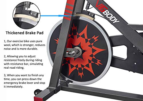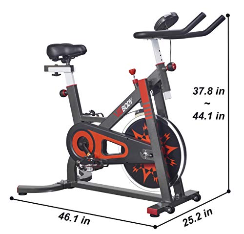 Details: VIGBODY Exercise Bike Cycling Bike Our Exercise Bike is a great priced quality bicycle. With Comfort and Bicycle Durability are the main advantages for your Health & Fitness Workout Success. Starts pedaling towards your fitness with a quality stationary bike that offers a smooth, quiet and comfortable ride every time. Enjoy your successful quality workout start toning your body core and legs muscles. Product Features Enjoy the comfort and pleasure of fitness training exercise now. Great indoor cardio workout equipment for cycling bike lovers. Easy & convenient to use for your comfortable riding posture, you can adjust Saddle horizontally and vertically, you can also adjust Handlebar vertically. High quality steel constructed, super strong and durable, Max user weight: 330lbs. Friction braking system and emergency lock, various tension / resistance control level to meet your needs. With comfortable padded seat handlebar and pedals. Multi-function LCD displaying-easily records and reads the exercise time, speed, distance, calories consumption, odometer. Specifications: Heavy Duty Flywheel: Free noise and Good resistance control Drive: Belt Net Weight: 64lbs Carton Size:35x8.7x32.9in. Lifetime warranty and great customer service. Customer satisfaction is our top priority. Please don’t hesitate to contact us if this item dose not meet your expectations.