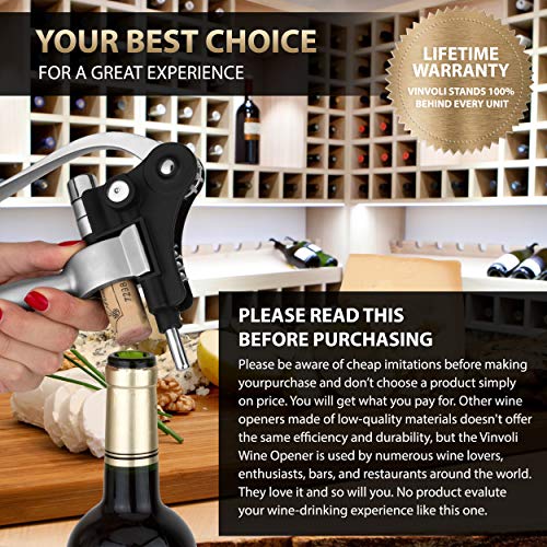 Details: Perfect Wine Bottle Opener Kit When you purchase our wine opener set you will not only receive a product that is made with excellence, but also you will see that our wine corkscrew kit has an incredibly simple design that makes it a fast wine opener - without losing its cute rabbit appeal (which is why it would be a great present for a lady in your life). While you do not need to be a wine connoisseur to open a bottle of wine the right way, you do need the tool of an expert – which is what you’ll find in our rabbit lever corkscrew. With this popular wine opener tool, you simply insert the corkscrew into the cork, pull, and in seconds your cork will have been removed!Everything you need comes in our wine corkscrew set. Included in the Vinvoli wine opener kit: 1. Lever wine bottle opener for opening any type of wine bottle cork just in few simple steps. Although it is a large manual wine opener, anyone can use this cork opener with ease. 2. Foil cutter that is safe yet effective. 3. Wine aerator allows you to taste the full character of a wine by allowing oxygen to react and bring out the flavor and aroma of your wine of choice. 4. Wine pump saver removes the extra air in your bottle to preserve (up to 10 days) the flavor of opened wine. 5. Extra spiral corkscrew (just in case). 6. This rabbit wine opener has special stand and it is very convenient to store in your kitchen or bar. 7. The wine opener set is stylishly packed, and every object has its own place for safe-keeping in beautiful presentation box. 8. Order our wine opener set and get your complimentary Wine Guide Ebook, be sure to check your email after your purchase for this PDF Ebook. Whether you need a gift for a man or a woman, our wine opener best seller is the perfect choice for any occasion. Enjoy this wine bottle opener kit soon by adding it to your cart today!