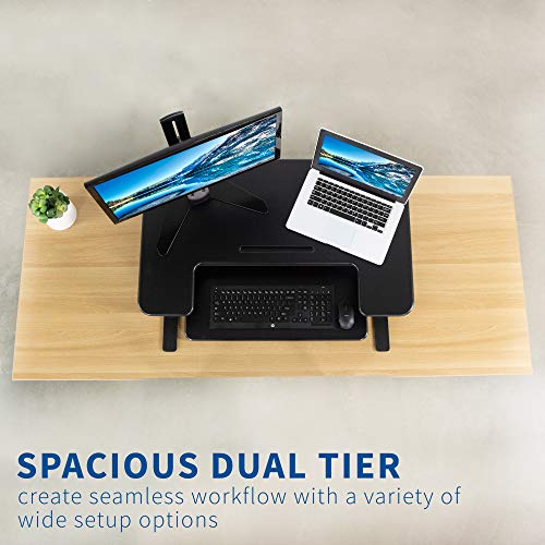 Details: Enhance your work experience with DESK-V000V, VIVO's height adjustable tabletop desk. This dual-tiered platform sits on top of your current desk and gives you the benefit of standing or sitting on demand. The keyboard tray is removable for user preference. Transitioning between sitting and standing throughout the long work day provides numerous health benefits for the body such as increased blood flow and reduced aches and pains. Standing throughout the day also helps the mind stay alert and productive.The top platform rests 6.5" from your desk's surface in sitting position and 17" when fully extended. The top surface measures 36" x 22" allowing you to customize your work area and create the workflow you need. Additionally, the 10.5" x 25" lower deck holds keyboard and mouse side-by-side and elevates in sync with the top surface, providing a comfortable workspace. The weight capacity for the entire desk is 33 lbs.