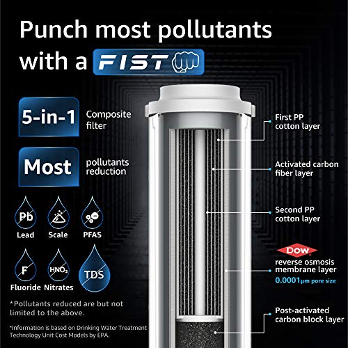 - 𝟓-𝐬𝐭𝐚𝐠𝐞 𝐜𝐨𝐦𝐩𝐨𝐬𝐢𝐭𝐞 𝐟𝐢𝐥𝐭𝐞𝐫 & 𝐞𝐟𝐟𝐞𝐜𝐭𝐢𝐯𝐞 𝐟𝐢𝐥𝐭𝐫𝐚𝐭𝐢𝐨𝐧: Waterdrop D6 RO water filter system adopts a 5-in-1 composite reverse osmosis filter with a DOW reverse osmosis membrane that has a pore size of 0.0001μm. The 5-stage filtration reduces pollutants from water, including TDS, lead, chlorine, salt, nitrates, PFAS, lead, sodium, chromium, benzene, etc. [1] Now you can enjoy high-efficiency filtration with just one filter!