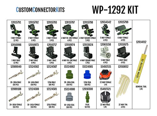 Details: The WP-1292 Pro Connector Assembly Kit contains 1,291 individual Genuine Delphi(Aptiv) parts. The kit includes enough 1-6 way, environmentally sealed, easy to use connectors with built-in CPA, as well as the 22 way bulkhead connectors, to build 43 connector assemblies, for a total of 145 individual isolate connections to prevent cross wiring and shorting. It comes with 20-12 AWG crimp terminals rated for 20 Max. Amps, and triple ribbed silicone rubber cable seals. This kit also includes a 12014254 ratcheting crimp tool, that crimps terminals and seals in one fluid motion. One removal tool comes standard with this kit, fits all terminals included, and our removal tools are manufactured by the same company that manufactures them for Delphi.