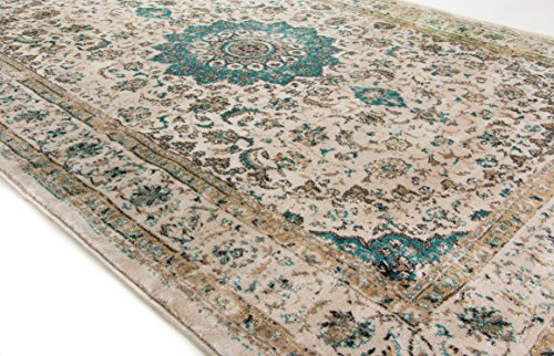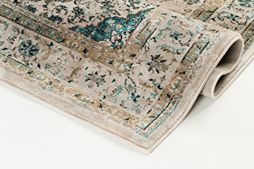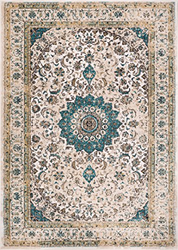 Details: Djemila Medallion Beige is a classic Old World style updated with modern design elements. A traditional Persian medallion design is refreshed by a contemporary palette of neutral ivory and beige with accents of blue and yellow. The intricately detailed pattern is heavily distressed to give the faded quality of an antique passed down through generations. A thick 0.5" pile of heat set polypropylene gives an exceptional plush feel and precise pattern definition. The yarn is soft, stain resistant, and doesn't shed or fade over time. A 100% jute backing is safe for wood floors and all four sides of the rug are serged for improved durability.