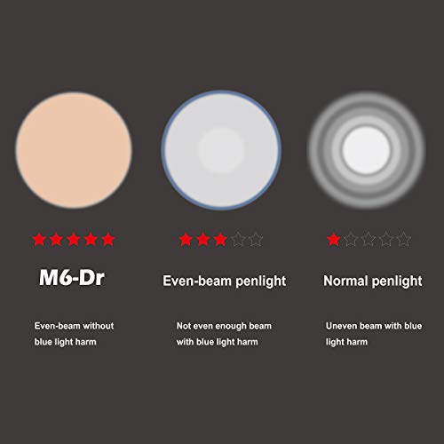 Designed with the medical professionals in mind, the M6-Dr no-glare LED flashlight features a warm white LED with 3000K color temperature and color rendering index of 85%, rivaling those of the incandescent lights. The true color rendering aids doctors in exams, avoids misdiagnosis caused by glaring light distorting skin and tissue tones. The soft even light will not disturb the doctor's nor the patient's vision. Using an optical glass lens with light transmission rate of over 90%, coupled with a light emitting angle of 30 degrees, the M6-Dr creates a circle of perfectly distributed even light. The area within the light circle has no dark spot, no glare, and no distracting uneven lighting anywhere. The 4.5 lumen output is perfect for the optometrist and ophthalmologist to conduct examinations.