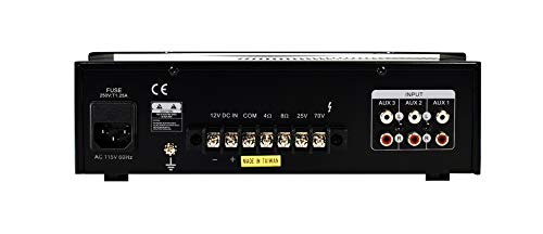 Details: 30W RMS compact amplifier. Features three mic (1/4") inputs and an additional 3 aux (RCA) inputs. Mics volumes can be controlled individually. Great for classrooms, conference rooms, office buildings and etc.