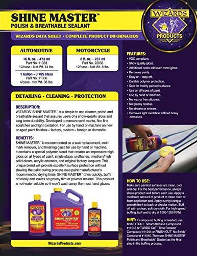 Details: Whether you’re a proud owner of a new car, show car, motorcycle, boat, airplane, RV or just a nice vehicle, you will appreciate the quick and easy application of our best-selling Shine Master Polish & Breathable Sealant (16oz 11033 – Gallon 11036). This car polish/paint sealant is simple to use as a car paint cleaner, polish and breathable sealant that assures users of a high gloss showroom shine and long term super surface sealer. Developed for car detailing as a swirl remover to renew auto paint by reducing fine line scratches and light oxidation for that deep glossy finish. Easy to use by hand or with a polisher machine on new or aged paint surfaces. Shine Master dries quickly, buffs off easily and leaves no greasy film or powder residue. This polish sealant is not water soluble so it won't wash away like most glazes. Used, recommended and sold by body shops for decades because of its versatile ease of use, ability to polish out swirls and micro polish custom paints, while leaving behind an incredible gloss and polymer protective coat that adds car paint protection. If your paint doesn’t’ need polishing but you just want to add gloss and protection, simply use a foam applicator pad dampened with water and you can actually build layers of shine that give you a crystal clear reflection. For the best layering effect you should wait 24 to 48 hours for the cross-linking to cure, that way you can add a gloss layer easier without removing the previous coat. All Wizards Products are compliant with current VOC and prop 65 regulations and Shine Master contains no traditional wax (that could cloud or yellow the paint), damaging chemicals or harsh abrasives. Labels display GHS warnings and pictograms as required for professional use.