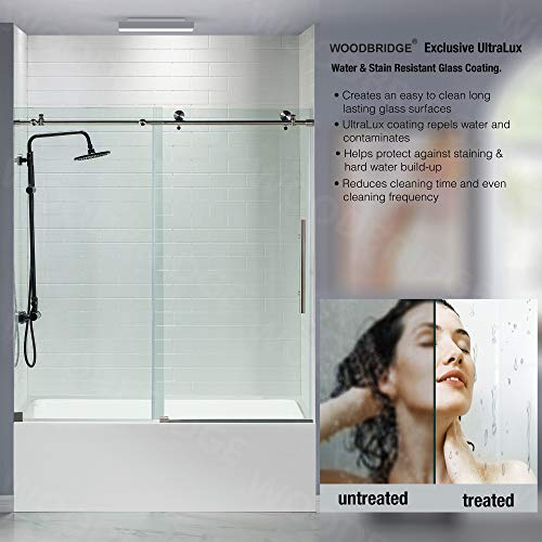 Details: Luxurious Modern Design: Clean, sleek look and compliment with different styles like modern, craftsman, traditional and etc. Frameless Sliding Tub Door Design: 56" - 60" width (adjustable) x 62" height. Door walk-in: 25 5/8". Stationary panel: 29 5/8". Glass: Premium clear 3/8" (10 mm) thick tempered safety glass. ANSI certified. Finish: Brushed nickel stainless steel finish. Rollers: Large solid stainless steel rollers, creating smooth and effortless sliding. quiet door operation. top rail support ensures wall anchoring and reinforces wall stability. Stainless Steel Construction Design: High quality stainless steel hardware will not rust, chip or scratch off. for life use. Installation Adjustment: ---- Width Adjustment: can trim stainless steel top guide bar up to 4" on the opening side ---- The wall mount brackets for the structural rail have 13mm built-in adjustability: Limited 5 (five) year manufacturer Certification: ANSI Z97. 1 Certified Matching shower base NOT included. Please search Woodbridge shower base to buy separately. This shower door can be used without shower base. All measurements should be taken only after walls are finished (tile, back walls, etc. ). About Woodbridge: Woodbridge specializes in selling high quality kitchen and bathroom products since 2005 . We are committed to providing each customer with the highest standard of customer service and best value products. Please don't hesitate to contact us if you have any questions or concerns. Customer Service Phone: 562-229-0088.