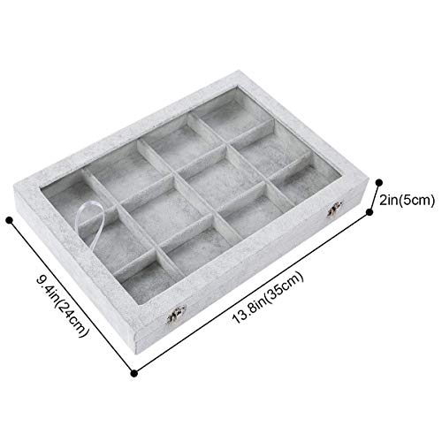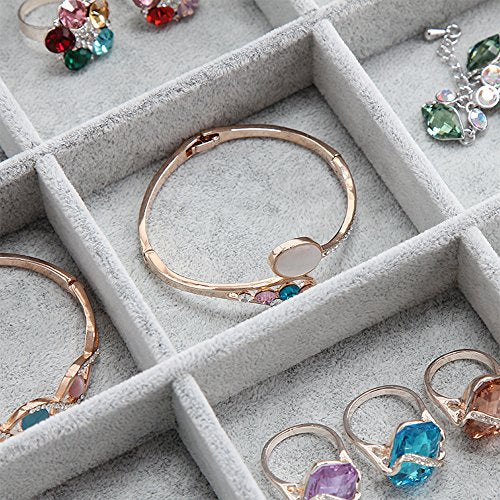 Details: Have you tired of organizing your jewelries every day? Wuligirl elegant jewelry and accessory storage tray can help you solve this problem.elegant display tray perfect for neatly storing and organizing all of your precious jewelry. Adds a stylish accent to your dresser or vanity. A perfect gift for anyone who wants their jewelry to stand out! Stackable Designs: You can put your bracelet, rings, earrings, necklaces on Jewelry Tray,and more with these modular trays that stack together and slide for added convenience. Durable Construction: Made of High Quality Wood and Velvet.Soft to the touch and will protect your jewelry and accessories from any kind of damage or abrasion. Occasion: Ideal for displaying high quality jewelry in retail stores or in your own home.It is also perfect for a countertop jewelry display in stores or trade shows. Tray dimensions : 13.78" x 9.45" x 1.96"/35cm*24cm*5cm (L x W x H) 12 lattice inner compartments dimensions :8 x 7.5 cm(3.14 x 2.95 inches). Package included:Jewelry Tray x 1 (jewelry not included) Materials: Velvet, Color: Gray