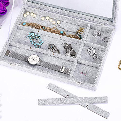 - Constructed with sturdy composite board wrapped in premium velvet fabric with removable compartment dividers and a glass lid to organize and protect your jewelries and accessories.