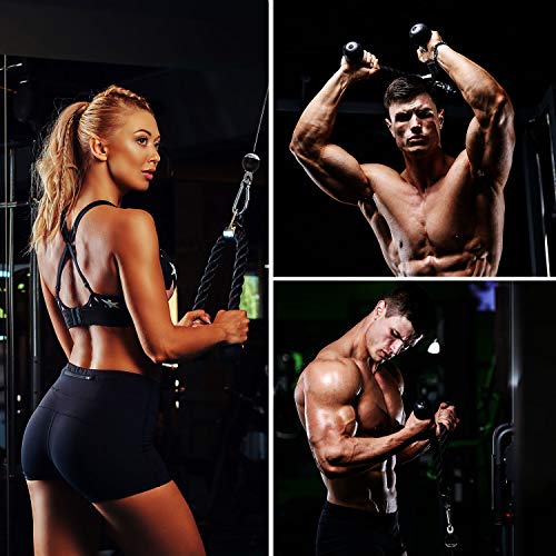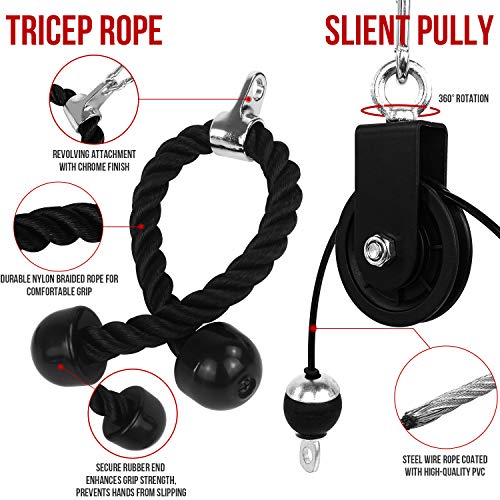 - 【Tricep Rope and 360° Rotatable Silent Pulley】 Come with a 26’’ Tricep Rope that made of heavy-duty black nylon braided rope with solid rubber ends and chrome plated swivel attachment provides fluently rotating movement. And Equipped a 360° rotatable silent pulley, made of special heavy steel, ensure stable and quiet of the pulley system operation. A variety of exercise actions can be obtained by changing the connection method of the hoist buckle ,high-quality cable rope, silent cable pulley.