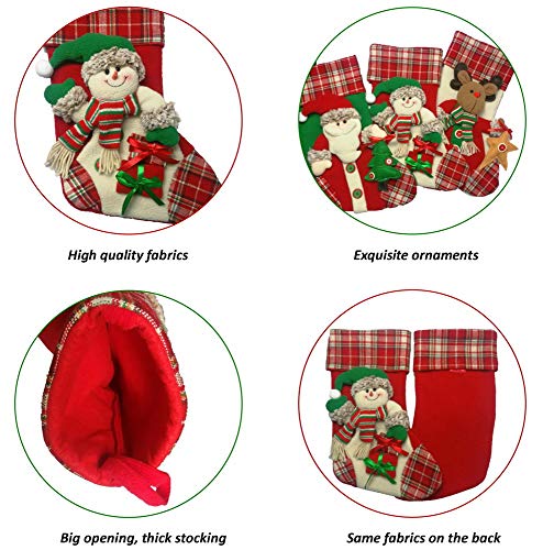 - DELICATE DESIGN - The characters Santa, snowman and reindeer on these lovely stockings are 3D. Each stocking has sturdy hanging loop. This is a very cute set and will match with the rest of your decoration.
