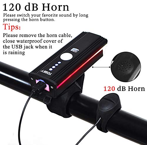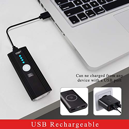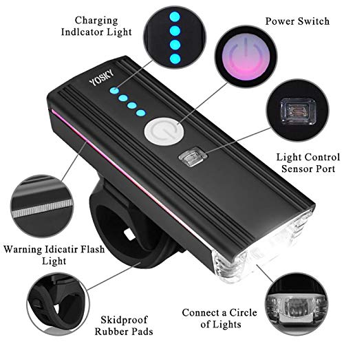 - 3: INTELLIGENT LIGHT CONTROL LIGHT & WATERPROOF -- Yosky Upgraded Bike Headlight headlights with intelligent light control lamp top and surround flashlight, suitable for cyclists riding in urban environments. Double click the power button for light control lamp, auto light up in the dark, more convenient when riding through the dark and light. Excellent waterproof, safer to use and driving, more convenient.