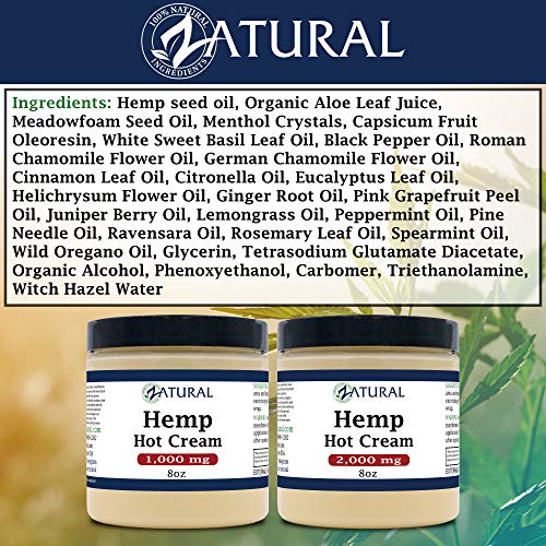 Details: Available in two strengths 1,000mg 8oz and 2,000mg 8oz Professional Strength* Hemp Seed Oil Infused Anti-Cellulite Therapy* Deep Muscle Pain & Relaxation* Slimming Massage Cream* Skin benefits w/ Omegas* 100% Pure* 87% Organic Therapeutic Grade* Skin Benefits - Hemp oils are a natural source vitamins (including B1, B2, B6 and D), trace minerals (including calcium, iron, magnesium, potassium and zinc), and omega 6 and 3 fatty acids with a balanced and healthy 3 to 1 ratio. Anti-Cellulite - This organic hot cream contains a professional grade formula that combats unwanted cellulite. Can be used in body wraps for amazing results. Can also be used to sweat for Thermogencis Weight Loss.* Relax Sore Muscles - Hemp Oil helps Soothe tight muscles with a quick and easy natural pain reliever.* Reduce inflammation - Hemp Oil acts as an Anti-Inflammatory providing professional strength synergy including pine, peppermint and Elemi.* Hot/Cold Sensation & Soothing Aroma - A great massage cream that soothes, relaxes, and tightens skin. Combination of therapeutic essential oils make this the most powerful, relaxing massage cream.* AFE Natural Ingredients - No Fillers, Harmful Fragrances, Dyes or Parabens, Manufactured in a GMP Certified Facility, Organic hot cream is Cruelty Free and Not Tested on Animals.