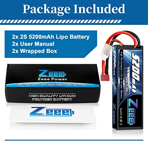 - 【What you get】- 2 Pack of Zeee 7.4V 50C 5200mAh 2S Lipo Battery Hard case with Dean-Style T Connector. Any product problems, please Contact US: 1. Enter into "Your Orders" to click "Contact Seller" option; 2. Click "Ask a question" on our storefront. We will get back to you within 24 hours.