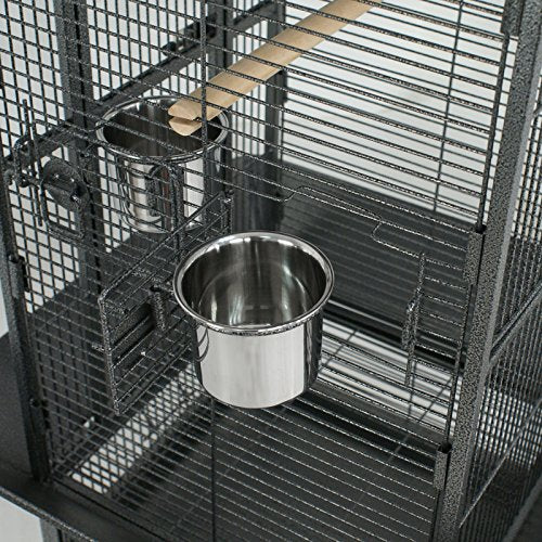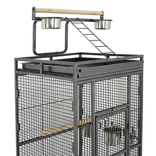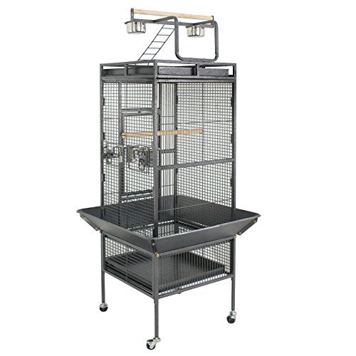 Details: ZENY Bird Cage features two wooden perches, heavy duty button lock, top playing area, handle design and heavy duty trays, 2 feeder doors, 4 rolling casters, removable tray. Our wrought iron bird cage is 25.6-inch long, 25.6-inch wide and 61-inch high with 1/2-inch wire spacing, makes the perfect home for multiple parakeets, canaries or finches and other similar size birds