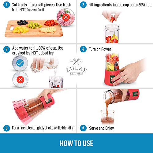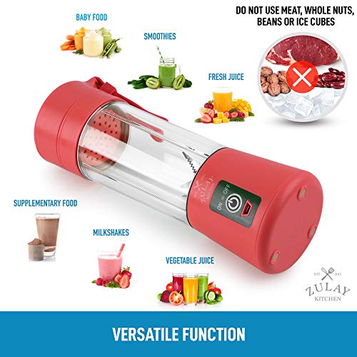 - SMOOTHIES ON THE GO Take your nutrient-rich fruit and vegetables, plus protein-filled yogurt and milk smoothie delights to the next level with the easy-to-use Zulay Kitchen Portable Blender. Made from high quality BPA-free and food grade materials, it is constructed with a safe insurance framework that keeps the blender from operating when the body and base are separated. Comes with Micro USB Charging Cable, 2 inserts, 1 instruction manual, 1 recipe, and a color box.